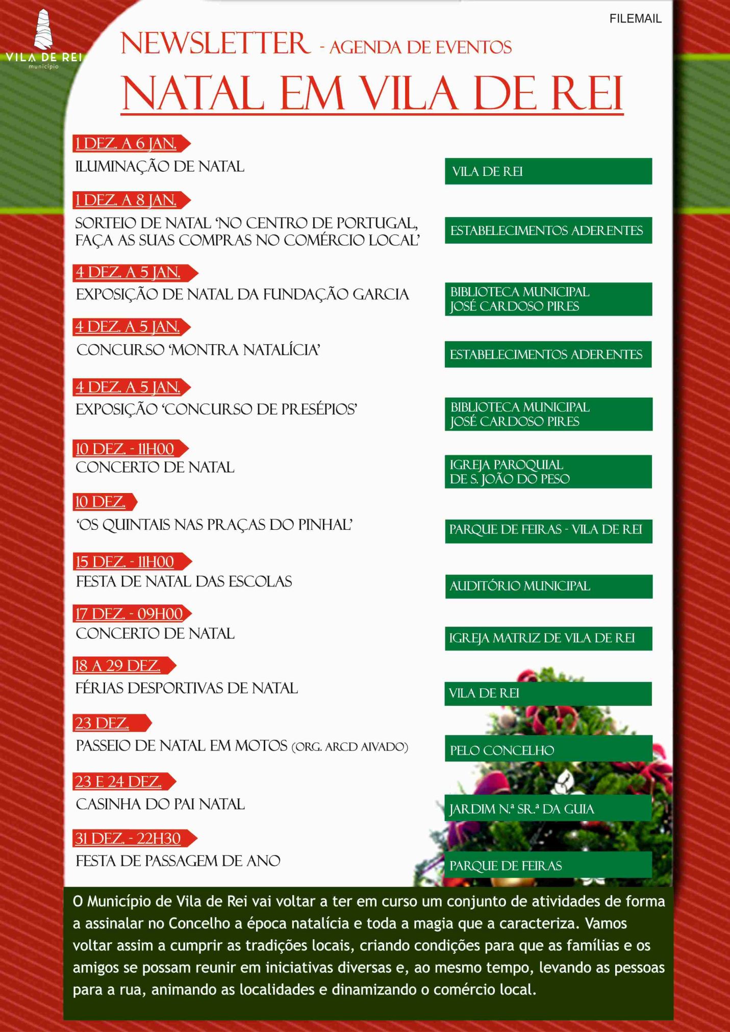 O Município de Vila de Rei vai voltar a apresentar um conjunto de atividades de forma a destacar no Concelho a época natalícia e toda a magia que a caracteriza. Para assinalar e embelezar as ruas de Vila de Rei, das sedes de freguesia e o Centro Geodésico, a Autarquia Vilarregense vai avançar novamente com as já tradicionais decorações e iluminações natalícias. Esta ação vai ter início já no…