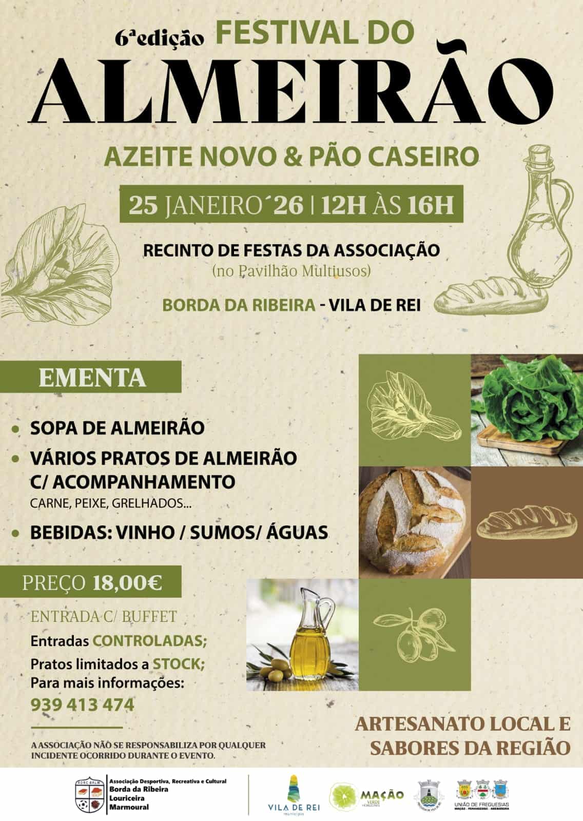 “6º Festival do Almeirão, Azeite Novo e Pão Caseiro” chega já no próximo domingo A ADRC Borda da Ribeira, Louriceira e Marmoural, com o apoio dos Município de Vila de Rei e Mação, Junta de Freguesia de Vila de Rei e União de Freguesias de Mação, Penhascoso e Aboboreira, organiza já no próximo domingo, 25 janeiro, a sexta edição do “Festival do Almeirão, Azeite Novo e Pão Caseiro”….