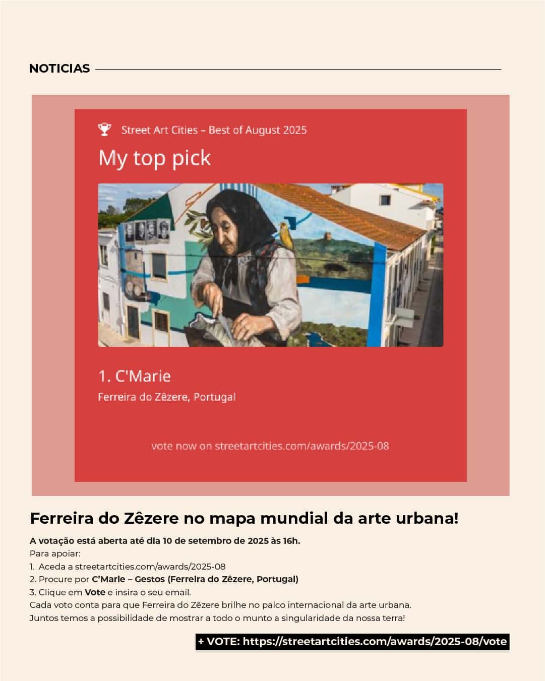 Ferreira do Zêzere no mapa mundial da arte urbana! O mural “Gestos”, da autoria da artista C’Marie, situado em Ferreira do Zêzere, foi selecionado pelo portal internacional Street Art Cities para concorrer ao prémio “Best of August 2025”, que distingue as melhores manifestações de arte urbana em todo o mundo. Esta obra, criada em julho de 2025, homenageia as mãos que moldaram a alma de Ferreira do Zêzere, símbolo de…