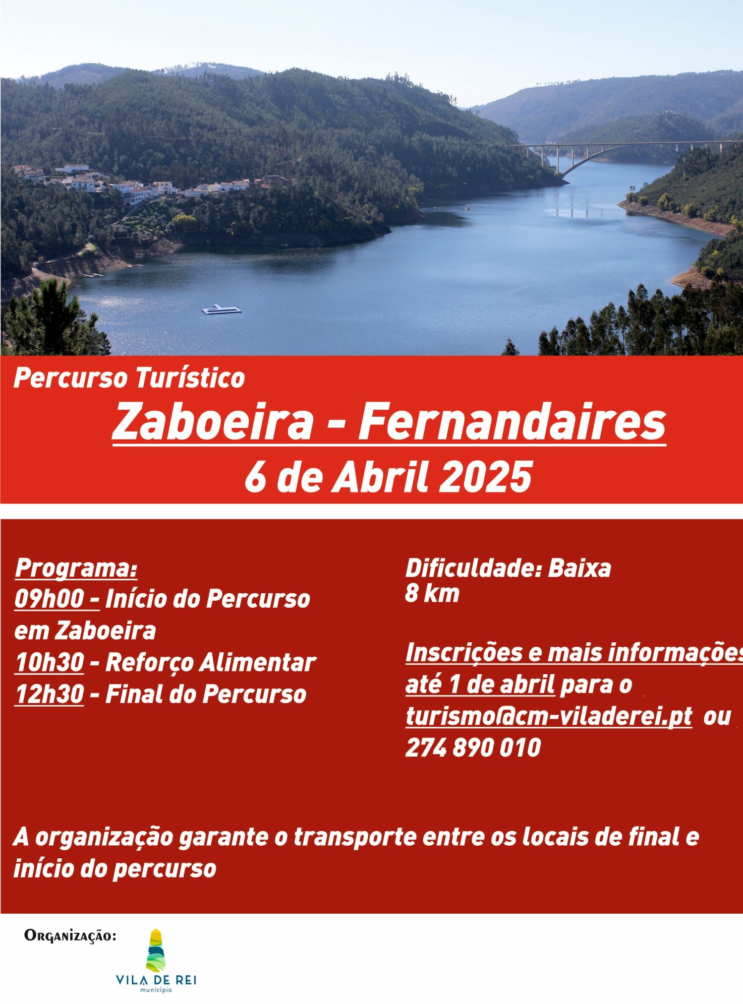 Percurso Turístico entre Zaboeira e Fernandaires com inscrições abertas até 1 de abril O Município de Vila de Rei organiza, já no próximo dia 6 de abril, um Percurso Turístico entre as localidades de Zaboeira e Fernandaires. O Passeio, com cerca de oito quilómetros, tem concentração marcada para a aldeia de Zaboeira. O programa da iniciativa prevê o início do Passeio pelas 09h00, com lugar a um reforço alimentar a…