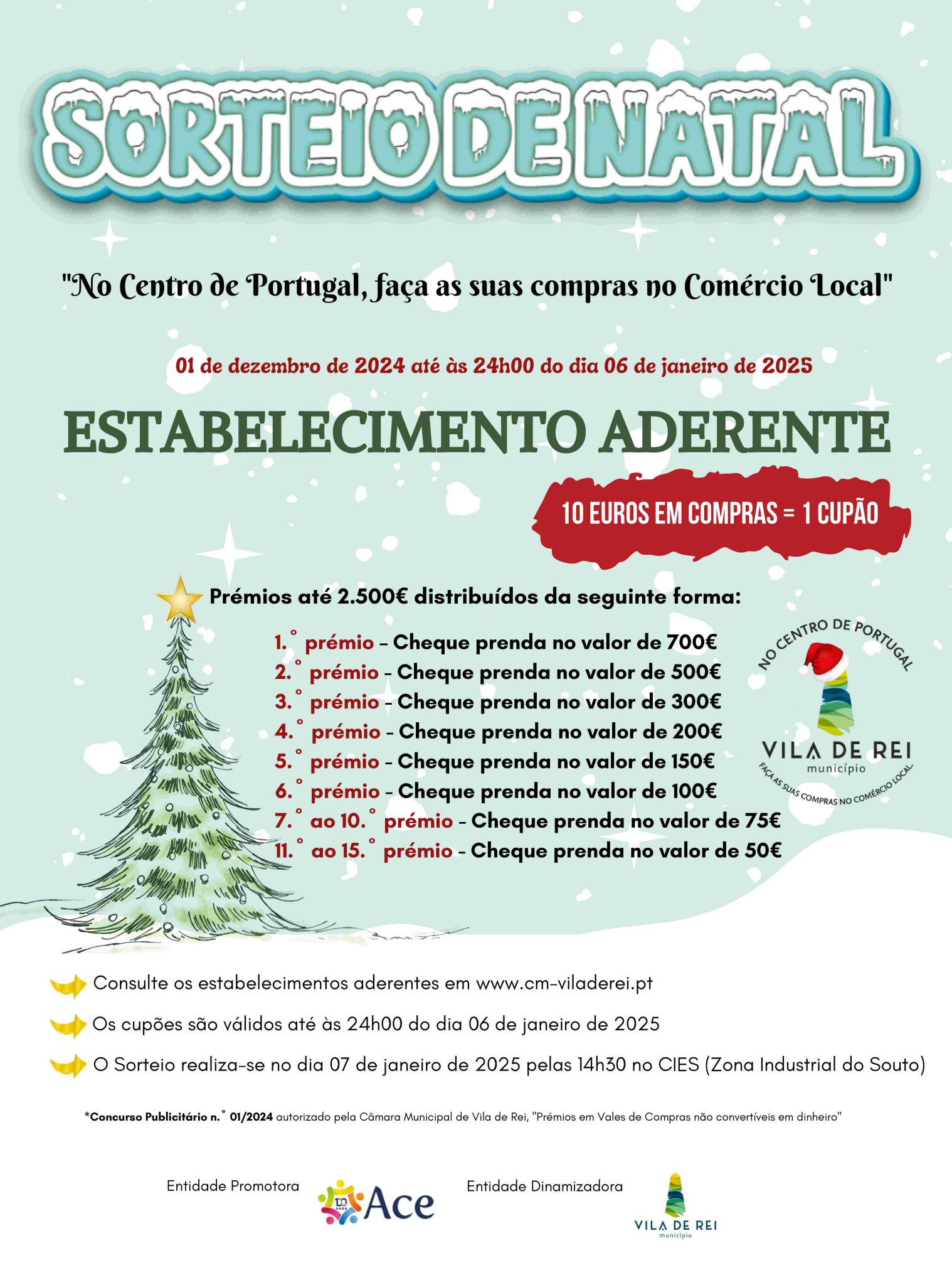Sorteio de Natal arranca no próximo domingo com 2.500€ em prémios A época natalícia no Concelho de Vila de Rei vai novamente ser marcada pelo Sorteio de Natal “No Centro de Portugal, faça as suas compras no Comércio Local”, iniciativa organizada pela Associação Comercial e Empresarial de Abrantes, Constância, Sardoal, Mação e Vila de Rei e dinamizada pelo Município Vilarregense, que volta a sortear um total de 2.500€ em prémios…