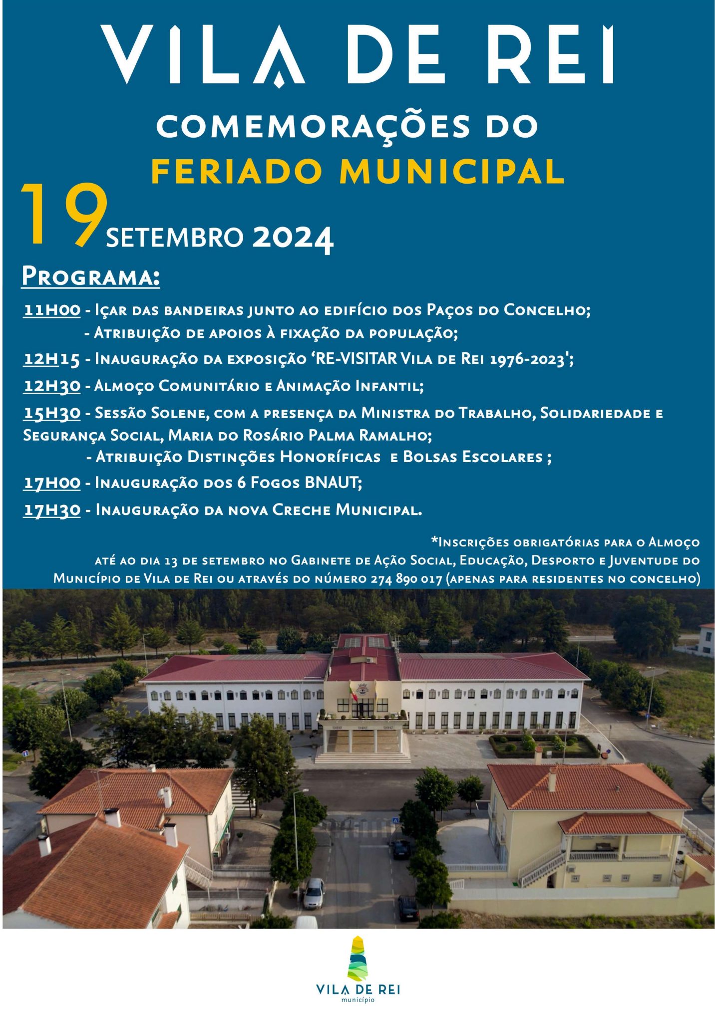 Comunicado à Imprensa Vila de Rei vai assinalar, no dia 19 de setembro, os 739 anos do Foral, atribuído por D. Dinis, que ergueu Vila de Rei a Concelho. As celebrações terão início pelas 11h00, junto ao edifício dos Paços do Concelho, com o içar das bandeiras, e logo de seguida, com a atribuição dos Apoios à Fixação de População Vilarregense, no Auditório Municipal Monsenhor Dr. José Maria Félix. Pelas…