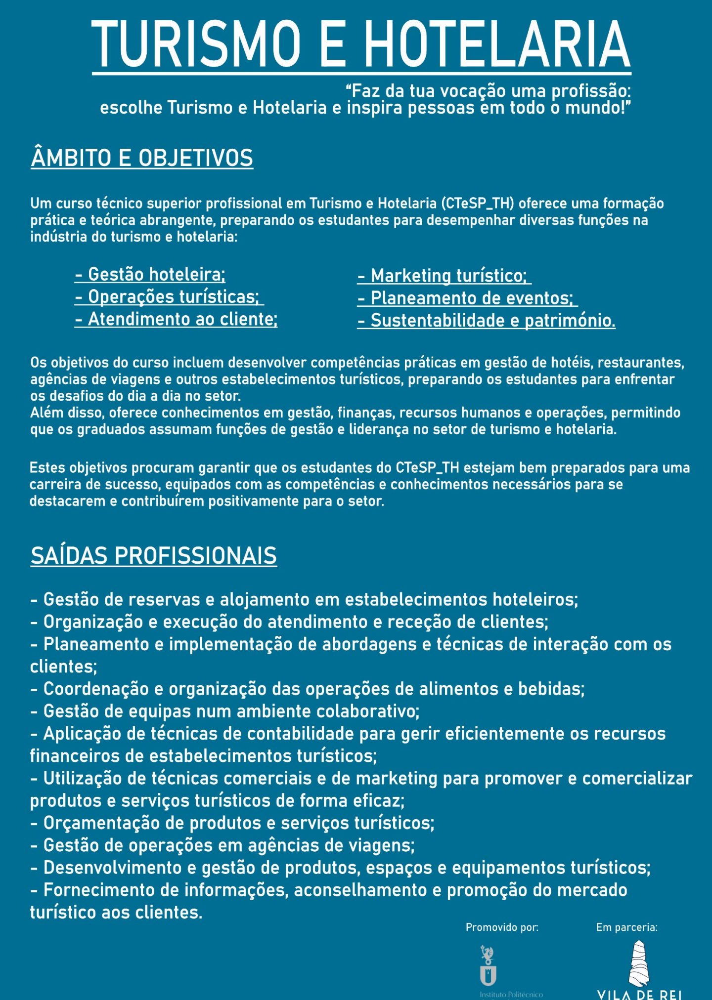 Vila de Rei vai receber Curso Técnico Superior Profissional de Turismo e Hotelaria Vila de Rei vai receber, já no ano letivo 2024/2025, a realização de um Curso Técnico Superior Profissional (CTeSP) de Turismo e Hotelaria, promovido pelo Instituo Politécnico de Castelo Branco, em parceria com o Município de Vila de Rei. O curso, aprovado pela DGES, será ministrado pela Escola Superior de Gestão de Idanha-a-Nova, com as aulas a…